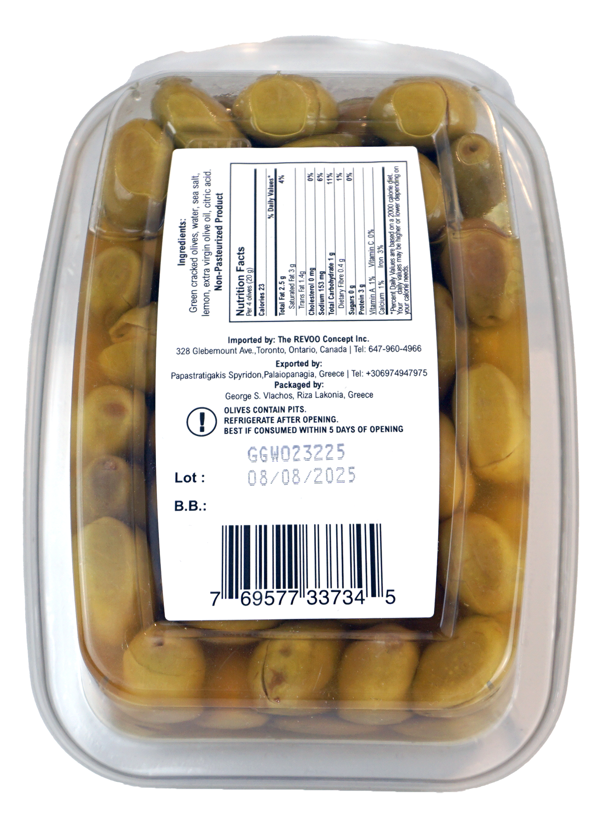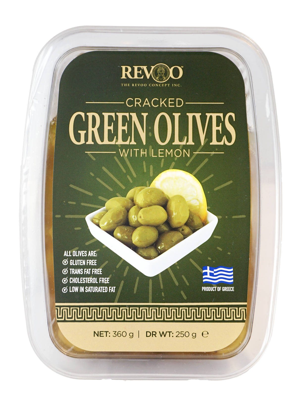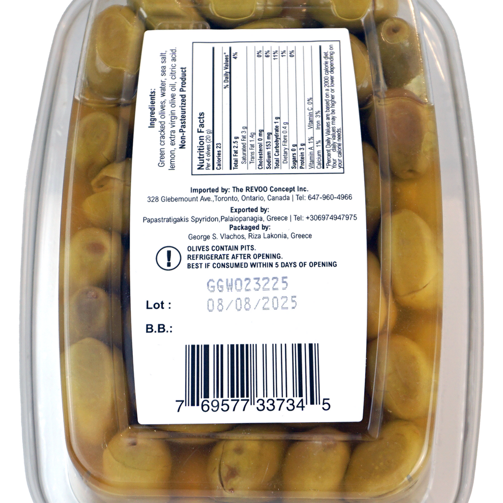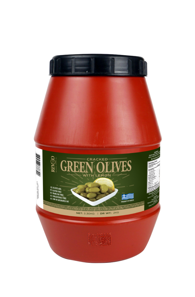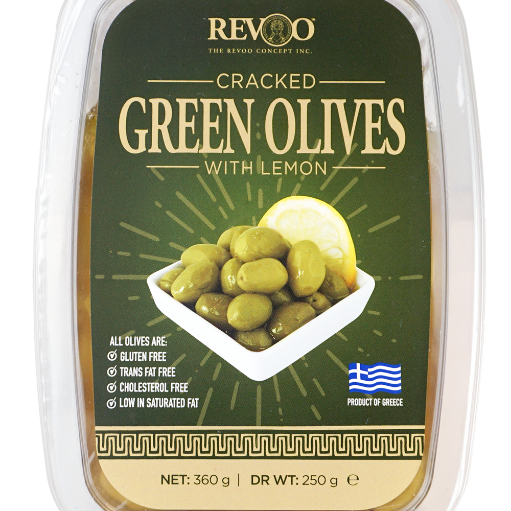 Revoo Green Cracked Olives: Firm, vibrant, and naturally fermented, these rustic green olives are stone-cracked to absorb full-bodied flavour, ideal for mezze platters and Mediterranean recipes.
